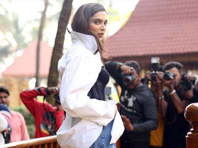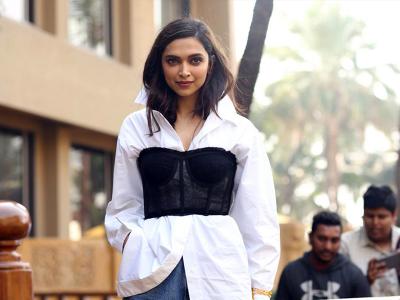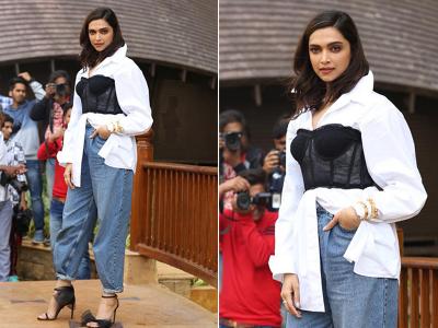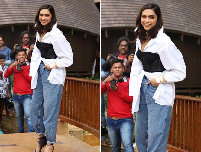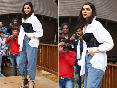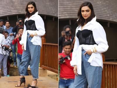 दीपिका ने वाइट शर्ट के ऊपर ब्लैक रंग का कोरसेट पहना हुआ है और जींस और हील्स पहनी हुई हैं और उनकी हील्स पर रिबन लगे हुए हैं।