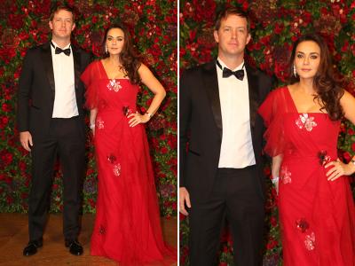 प्रीति जिंटा रेड ड्रेस में अपने पति गुडएनफ के साथ नजर आईं