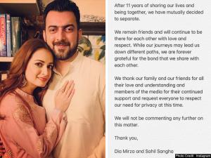 1 / 7बॉलीवुड के खूबसूरत कपल्स में से एक दीया मिर्जा ने साहिल संघा से अलग होने की बात को कंफर्म कर दिया है। 2 / 7पांच साल तक शादी के बंधन में बंधने के बाद दीया मिर्जा ने गुरुवार को पति साहिल से अलग होने की बात कही है। अपने सोशल मीडिया के माध्यम से एक्ट्रेस ने ये बात अपने फैंस तक पहुंचाई है।3 / 7अपने सोशल मीडिया अकाउंट पर पोस्ट शेयर करते हुए दीया ने लिखा, '11 साल साथ रहने प्यार और जिंदगी के हर पहलू को शेयर करने के बाद अब हमने अलग होने का निर्णय लिया है, हमने म्युचली ये निर्णय लिया है। हम अच्छे दोस्त रहेंगे और एक-दूसरे के लिए हमेशा साथ खड़े रहेंगे।'4 / 7दीया ने आगे लिखा, 'भले ही हमारे रास्ते अब अलग हो गए हों मगर मैं हमेशा अपने और उनके बीच के बॉन्ड के लिए शुक्रगुजार हूं। हम अपने घरवालों को अपने दोस्तों को शुक्रिया करते हैं उनके प्यार और सपोर्ट के लिए। अभी भी हम सभी से ये उम्मीद करते हैं कि हमारी प्राइवेसी में इस समय भी हमारा सपोर्ट करें। इस मामले में किसी तरह की टिप्पणी ना करें। धन्यवाद, दीया मिर्जा और साहिल सांघा'5 / 7बता दें पेशे से साहिल फिल्म मेकर हैं। साहिल, दीया मिर्जा के साथ मिलकर अपना प्रोडक्शन हाउस भी चलाते हैं। दोनों को कई बार एक साथ पार्टीज और अवॉर्ड्स नाइट में देखा गया है।6 / 7मगर अचानक ही दीया मिर्जा के इस फैसले ने उनके चाहने वालों को चौंका दिया है।7 / 7दोनों की पहली मुलाकात साल 2009 में एक फिल्म की स्क्रिप्ट नरेटिंग के टाइम हुई थी। साल 2014 में साहिल ने न्यू यॉर्क में दीया मिर्जा को प्रपोज किया था। 18 अक्टूबर 2014 में दोनों ने शादी कर ली। अब पांच साल बाद दोनों का यह निर्णय लोगों को हैरान करने वाला है।