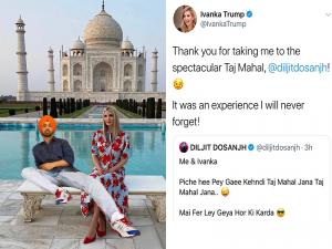 1 / 8पंजाबी सिंगर दिलजीत दोसांझ ने हाल ही में अपने Instagram अकाउंट पर Ivanka Tump के साथ एक फोटो शेयर की है।2 / 8इस फोटो में सिंगर दिलजीत दोसांझ इवांका ट्रंप संग ताजमहल के सामने नजर आ रहे हैं।3 / 8दिलजीत की इस मॉर्फ तस्वीर पर इवांका ट्रंप ने जवाब में 'शुक्रिया' कहते हुए मैसेज लिखा है।4 / 8हाल ही में इवांका ट्रंप भारत के दौरे पर थीं और उन्होंने ताजमहल का दीदार भी किया था।5 / 8इवांका के जवाब के बाद दिलजीत दोसांझ सोशल मीडिया पर काफी खुश नजर आए।6 / 8और उन्होंने लिखा 'अतिथि देवो भव: शुक्रिया इवांका ट्रंप' मैं सब को बताना चाहता हूं की ये फोटोशॉप नही है, और अगली बार लुधियाना जाना पक्का है।7 / 8साथ ही सोशल मीडिया पर कई और फनी फोटो भी वायरल हो रही हैं।8 / 8जिनमें कई लोग अपनी फोटोज को मॉर्फ कर Ivanka Tump के साथ शेयर कर रहे हैं।