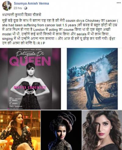 सौम्या ने फेसबुक पर लिखा, 'मुझे बड़े दुख के साथ ये बताना पड़ रहा है कि मेरी कजिन दिव्या चौकसे का कैंसर की वजह से बहुत छोटी सी उम्र में निधन हो गया है।