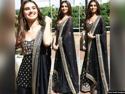 हाल ही में तारा सुतारिया फिल्म प्रमोशन के दौरान ब्लैक लहंगे में नजर आईं।