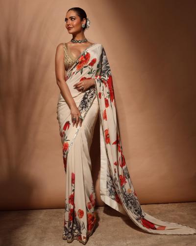 इन फोटोज़ में ईशा गुप्ता व्हाइट कलर की साड़ी पहनी है जिसमें बड़े-बड़े रेड फ्लॉवर प्रिंट है और उनका डीपनेक ब्लाउज़ फैन्स का ध्यान खींच रहा है। (फोटो: इंस्टाग्राम)