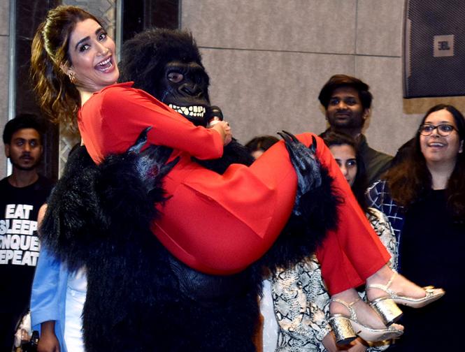 एक फोटो में शो की कंटेस्टेंट करिश्मा तन्ना गोरिल्ला की गोद में नजर आ रही हैं।
