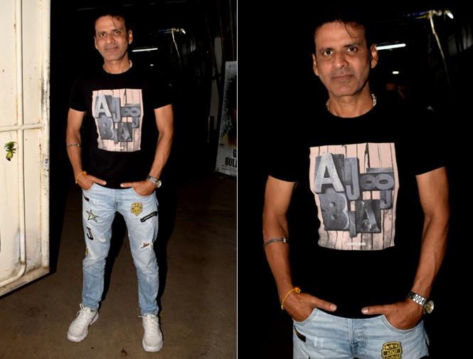 मनोज बाजपेयी अपनी फिल्म 'गली गुलियान' की स्क्रीनिंग के डरूँ ब्लैक टी शर्ट और ब्लू जीन्स में नजर आए।