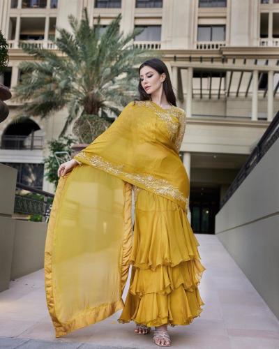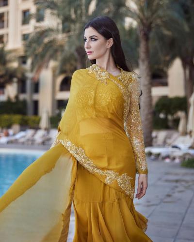 इन तस्वीरों में जॉर्जिया एंड्रियानी ने मस्टर्ड कलर की साड़ी पहने हुए नजर आ रही हैं। (फोटो: इंस्टाग्राम)