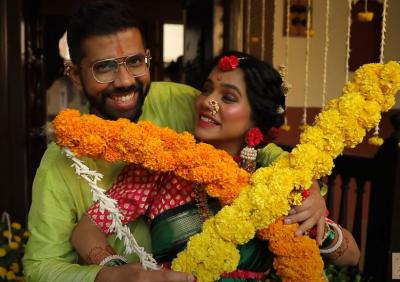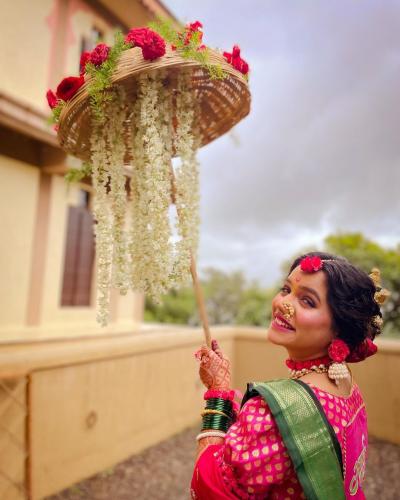 इस फोटो में उन्होंने हरे और गुलाबी रंग की साड़ी, नाक की नथ, माथे पर हल्दी कुमकुम और सिर पर फूलों की माला पहनी हुई है।