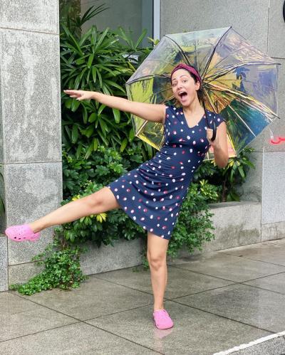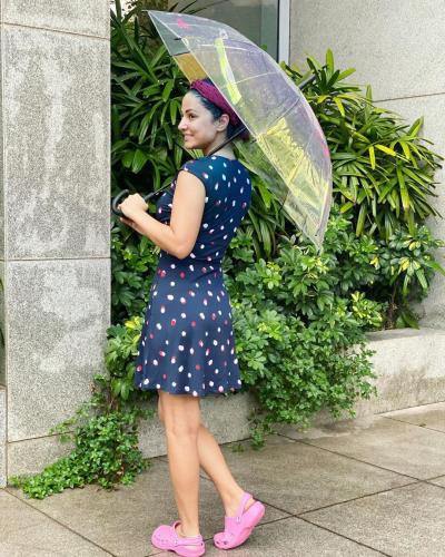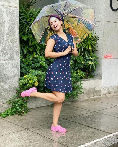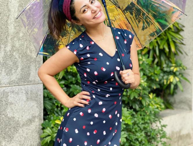 तस्वीरों में हिना खान हाथ में छाता लिए मस्ती के मूड में नजर आ रही हैं।