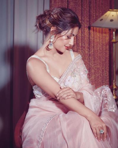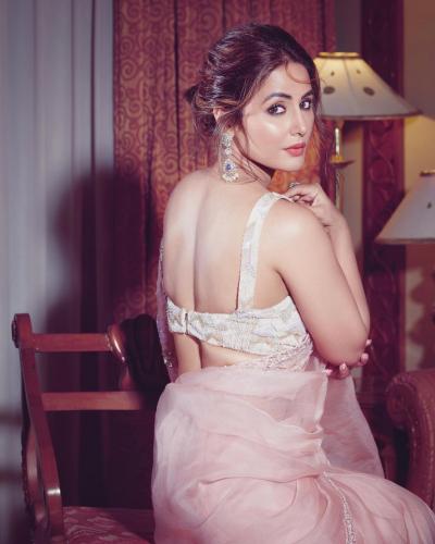 इन तस्वीरों में हिना खान लाइट पिंक कलर की साड़ी में बला की खूबसूरत लग रही हैं। (फोटो: इंस्टाग्राम)