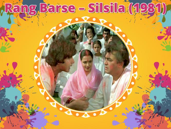 रंग बरसे: फिल्म सिलसिला (1981) में यह गाना अमिताभ बच्चन और रेखा पर फिल्माया गया यह गाना अमिताभ के पापा हरिवंशराय बच्चन ने लिखा था। होली में यह गाना ना चलाया जाए तो मजा आता ही नहीं है।