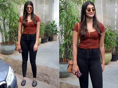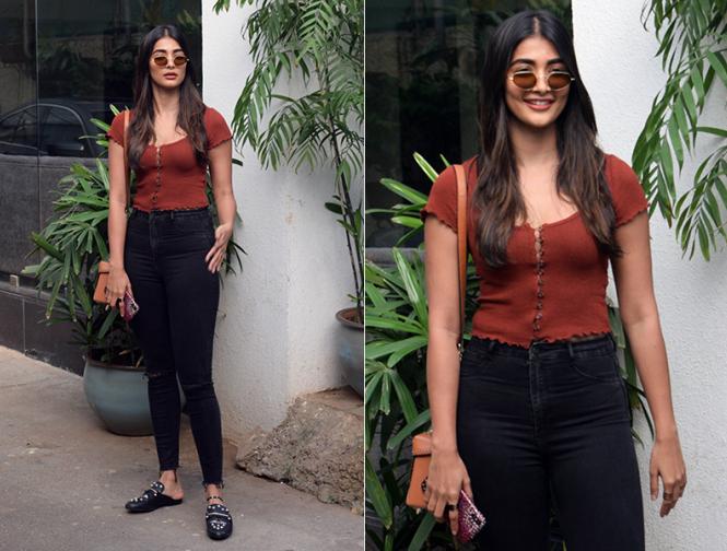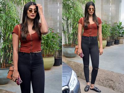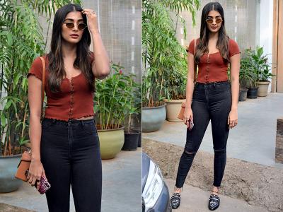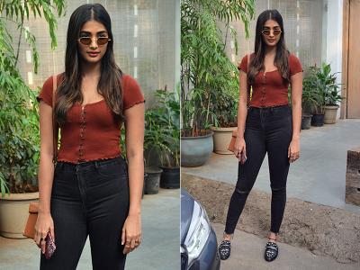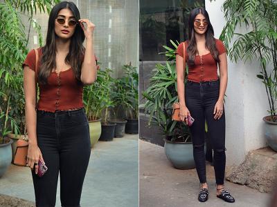 पूजा का ब्राउन टॉप और ब्लैक जीन्स में बोल्ड और स्टाइलिश लुक इंटरनेट पर काफी वायरल हो रहा है।