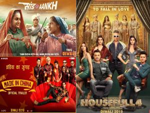 1 / 9इस Diwali Box Office पर एक साथ तीन फिल्में रिलीज हो चुकी हैं, इस लिस्ट में शामिल हैं, Housefull 4, Made in China और Saand Ki Aankh2 / 9पहले नंबर पर है अक्षय कुमार की Housefull 4, फैंस के बीच हाउसफुल 4 को लेकर पहले से ही काफी क्रेज था।3 / 9इस फिल्म में अक्षय कुमार ने कई स्टंट भी किए हैं, और साथ ही फिल्म में उनकी कॉमेडी का तड़का भी शामिल है।4 / 9फिल्म में रितेश देशमुख, बॉबी देओल, कीर्ति सेनन और कई बड़े कलाकार भी हैं।5 / 9फिल्म सांड की आंख में सांड की आँख में भूमि पेडनेकर और तापसी पन्नू ने शूटर का किरदार किया है, फैंस को उनका ये लुक काफी पसंद आ रहा है।6 / 9फिल्म सांड की आंख की कहानी उत्तर प्रदेश के बागपत की शूटर दादियों चंद्रो और प्रकाशी तोमर के जीवन पर बनी है।7 / 9फिल्म की कहानी में ये दिखाया गया है की कैसे उत्तर प्रदेश के बागपत के जोहरी गांव की चन्द्रो और प्रकाशी तोमर शूटर बनीं।8 / 9मेड इन चाइना में फिल्म राजकुमार राव और मौनी रॉय को एक साथ देखने के लिए फैंस काफी समय से इंतजार कर रहे थे।9 / 9फिल्म मेड इन चाइना की कहानी गुजराती बिजनेसमैन पर आधारित है।