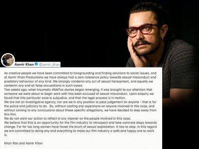 आमिर खान ने कहा- ''हम यौन उत्पीड़न के किसी भी मामले की निंदा करते हैं। इसके साथ ही ऐसे मामलों में झूठे आरोपों की भी बराबर निंदा करते हैं।
