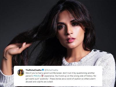 ऋचा चड्ढा ने कहा- कोई भी लड़की लाइमलाइट और मीडिया में आने के लिए ऐसे आरोप नहीं लगाती तो आप #MeToo को लेकर ऐसे सवाल ना उठाए।