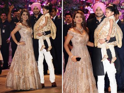 भारतीय क्रिकेट टीम के गेंदबाज हरभजन सिंह और बॉलीवुड अभिनेत्री गीता बसरा अपनी बेटी के साथ भी सगाई में पहुंचे।
