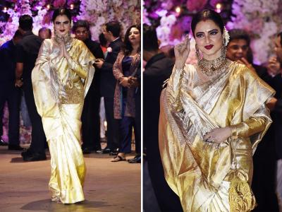 एक्ट्रेस रेखा ने सिल्क गोल्डन कलर की साड़ी में बेहद खूबसूरत लग रही थीं।