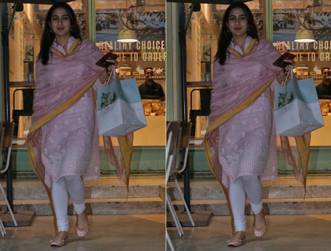 पिंक कलर की कुर्ती और सफेद कलर की लेगीज में सारा अली खान बेहद खूबसूरत नजर आ रही हैं।