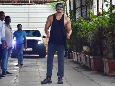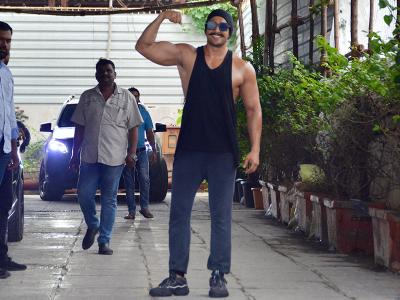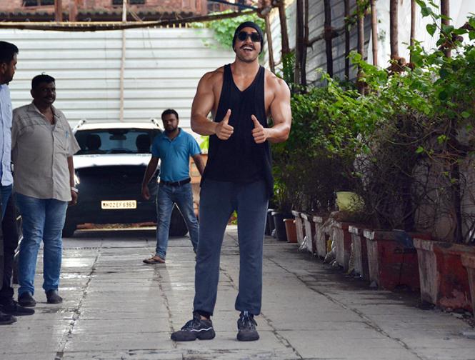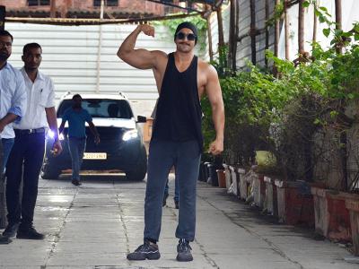 जिम के बाहर रणवीर सिंह ने अपने अंदाज़ में बाइसेप्स दिखाए।