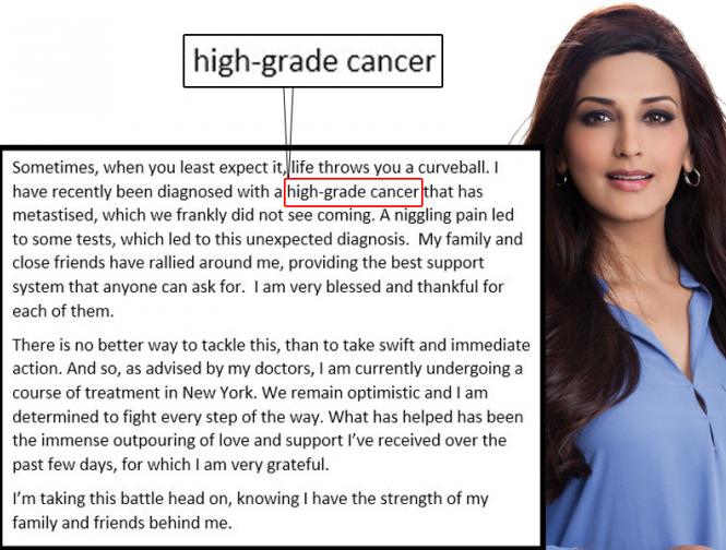 बॉलीवुड एक्ट्रेस सोनाली बेंद्रे ने कैंसर रोग से पीड़ित हैं और न्यूयार्क में अपना इलाज करवा रही हैं।