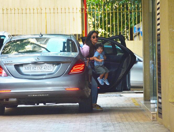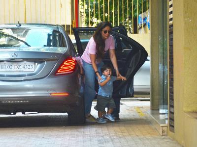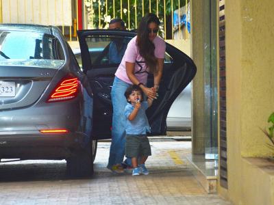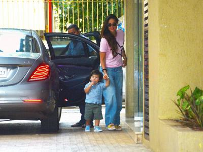 हाल ही तैमूर अली खान अपनी मम्मी करीना कपूर के साथ मौसी करिश्मा कपूर के घर बांद्रा में हुए स्पॉट।