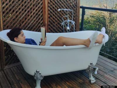 इस तस्वीर में इरा खान स्विमिंग पूल में नहाते हुए, जबकि दूसरी फोटो में बाथटब में लेटकर किताब पढ़ती दिखाई दे रही हैं।