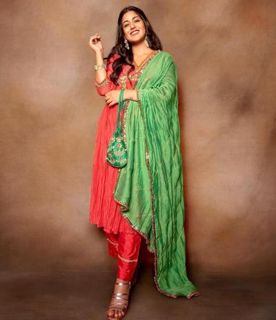 इन तस्वीरों में इशिता ने ऑरेंज कलर का लॉन्ग सूट पहना हुआ है और इसके साथ में ग्रीन कलर कैरी किया हुआ हैं। (फोटो: इंस्टाग्राम)