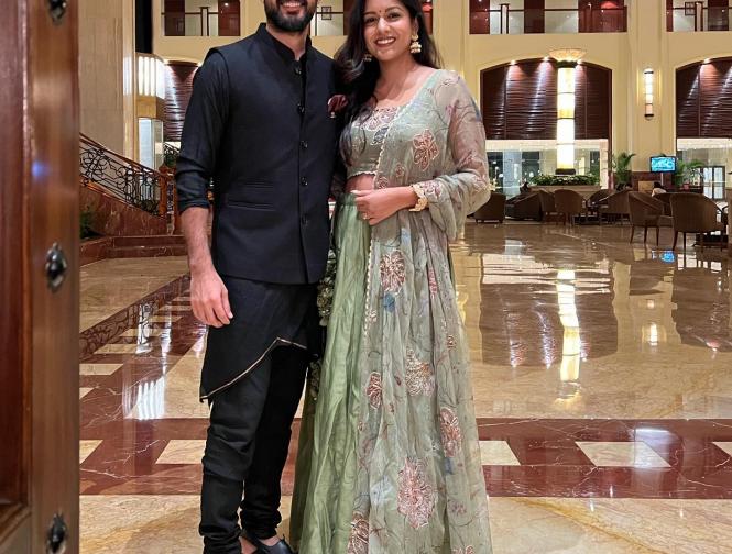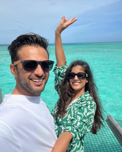 इन तस्वीरों में इशिता दत्ता और पति वत्सल शेठ के साथ बीच पर पोज दे रही हैं और दोनों ने मैचिंग कलर का आउटफिट पहने हुए हैं। (फोटो: इंस्टाग्राम)