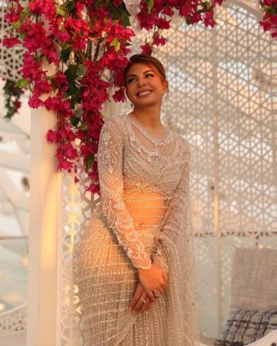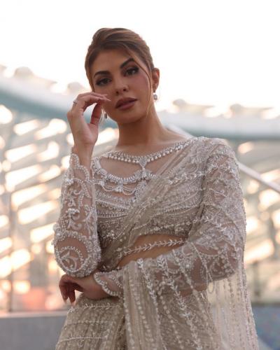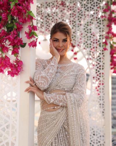 इन हालिया तस्वीरों में जैकलीन ग्रे कलर की कढ़ाईदार ट्रांसपेरेंट साड़ी में बला की खुबसूरत नजर आ रहीं थीं। (फोटो: इंस्टाग्राम)