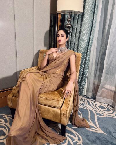 जाह्नवी ने अपने लुक को पूरा करने के लिए लाइट मेकअप किया है और इसके साथ मरून रंग की डार्क शेड लिपस्टिक लगाई हैं। (फोटो: इंस्टाग्राम)