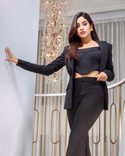 इन तस्वीरों में जाह्नवी कपूर ब्लैक कलर के क्रॉप टॉप के साथ ब्लैक पैंटसूट पहने बॉस लेडी लुक में नजर आ रहीं हैं। (फोटो: इंस्टाग्राम)