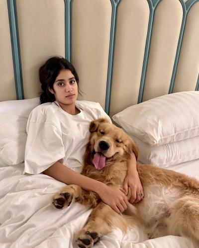 अगली फोटो में जाह्नवी कपूर बेड पर लेटकर अपने डॉगी के साथ एंजॉय करती नजर आ रहीं हैं। (फोटो: इंस्टाग्राम)