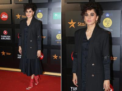 इंडो-वेस्टर्न लुक में तापसी पन्नू रेड कार्पेट पर दिखीं।