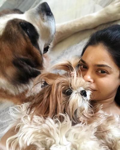 हाल ही में सुमोना ने घर पर अपने डॉग के साथ फोटो शेयर की है, जिसमें वो रिलेक्स करती नजर आ रही हैं। (Photo: Instagram)