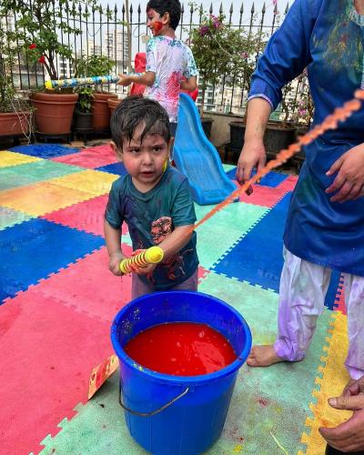इन फोटो में करीना ने ग्रीन कलर की टी-शर्ट पहनी है, वह तैमूर और जेह ने हाथ में पिचकारी लिए दिख रहे हैं। (फोटो: इंस्टाग्राम)