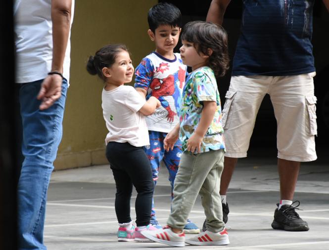 छोटे नवाब तैमूर ने कलरफुल टी-शर्ट और ग्रे ट्रैक पहनी है।