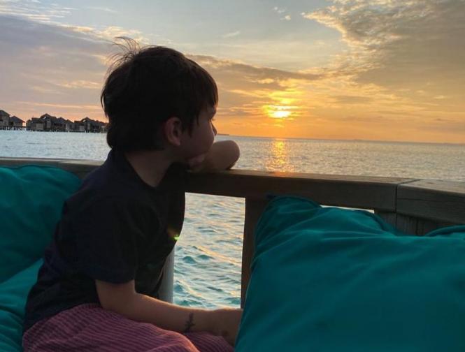 करीना ने तैमूर की तीन फोटो शेयर की हैं एक में तैमूर समंदर किनारे बैठे नजर आ रहे हैं। (क्रेडिट Instagram)