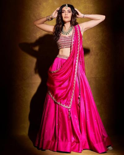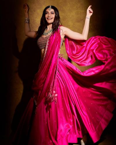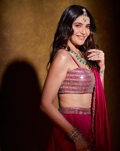 इन तस्वीरों में करिश्मा तन्ना पिंक कलर का लहंगा और साथ ही हेवी स्लीवलेस ब्लाउज पहना हुआ हैं। (फोटो: इंस्टाग्राम)