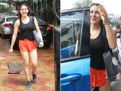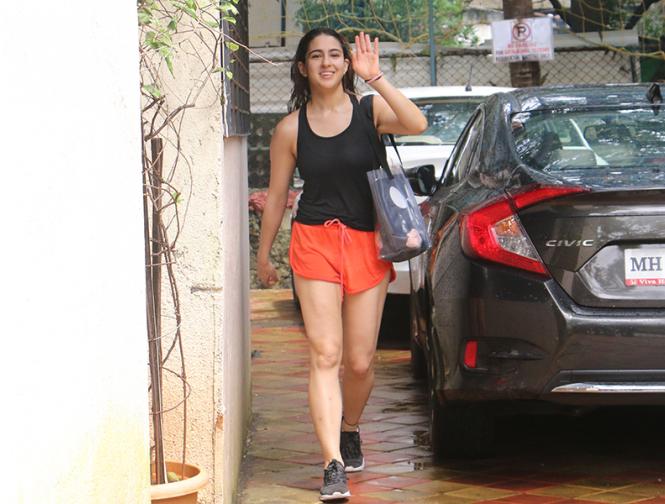 सारा इस दौरान ब्लैक टॉप के साथ ऑरेंज शॉर्ट्स में दिखाई दीं।