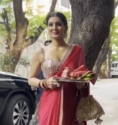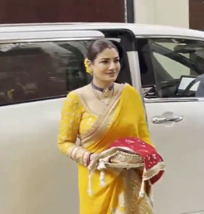 बॉलीवुड एक्ट्रेस रवीना टंडन सबसे अलग पीले रंग की साड़ी और हाथ में थाली पकड़े करवा चौथ सेलिब्रेशन में पहुंची, रवीना का ये ट्रेडिशन लुक सोशल मीडिया पर छाया हुआ है। (Photo Credit: ANI)