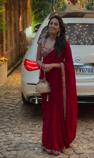 शाहिद कपूर की पत्नी मीरा राजपूत रेड कलर की साड़ी में बेहद ग्लैमरस लुक में करवा चौथ सेलिब्रेशन में शामिल होने पहुंची। (Photo Credit: Twitter)