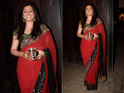 करवा चौथ मनाने अनिल के घर रवीना टंडन लाल कलर की ड्रेस में पहुंचीं