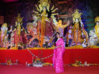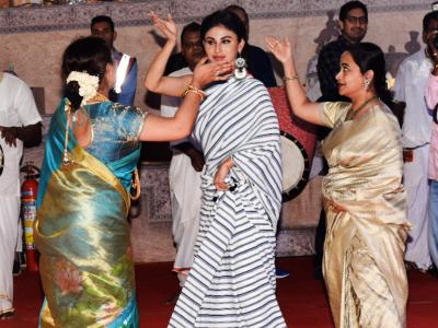 दुर्गा पूजा के पंडाल में पहुंचकर मौनी ने पारंपरिक अंदाज में डांस भी किया