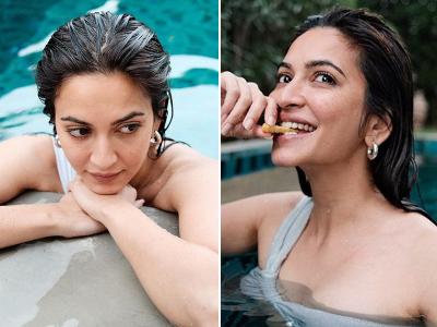 कृति खरबंदा पूल में फ्रेंच फ्राइज का मजा लेते हुए काफी क्यूट लग रही हैं। (फोटो: इंस्टाग्राम)