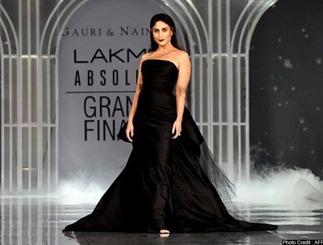 करीना ने मशहूर फैशन डिज़ाइनर गौरी और नयनिका के लिए लैक्मे फैशन वीक के फिनाले में रैंप वॉक की।