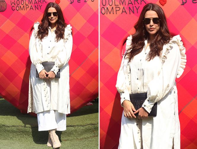 लेक्में फैशन वीक में बॉलीवुड सेलेब्स का जलवा देखने को मिल रहा है। इस मौके पर नेहा धूपिया सफेद रंग के इंडियन-फ्यूजन ड्रेस में दिखाई दीं।