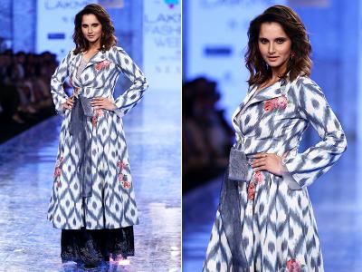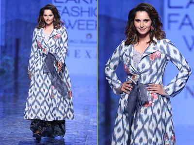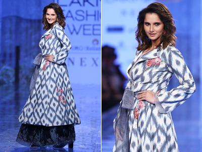 बतौर शोस्टॉपर उतरीं सानिया मिर्ज़ा एथनिक लुक में नज़र आईं। उन्होंने ग्रे रंग का फ्लोरल प्रिंट वाला लंबा कुर्ता पहना था जिसे उन्होंने बो-बेल्ट और ब्लैक स्कर्ट के साथ स्टाइल किया था।