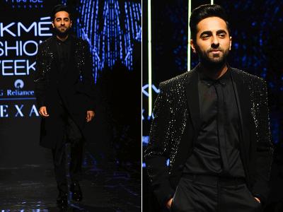 आयुष्मान खुराना ब्लैक आउटफिट में रैंप वॉक करते दिखे।