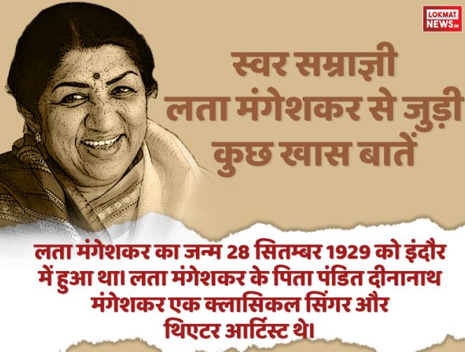 लता मंगेशकर का जन्म 28 सितम्बर 1929 को इंदौर में हुआ था। लता मंगेशकर के पिता पंडित दीनानाथ मंगेशकर एक क्लासिकल सिंगर और थिएटर आर्टिस्ट थे।-