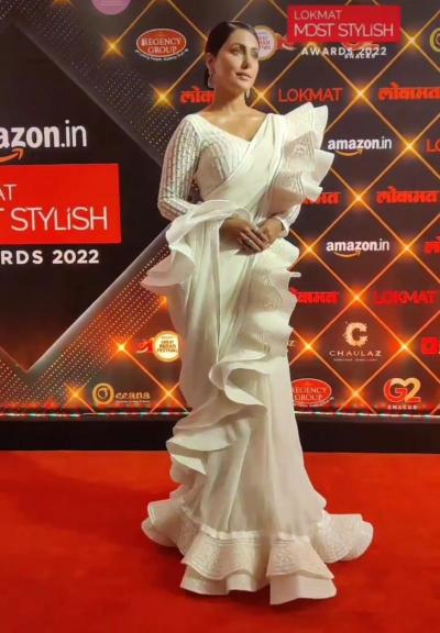 लोकमत मोस्ट स्टाइलिश अवार्ड्स 2022 में हिना खान व्हाइट साड़ी में बेहद स्टाइलिश लग रही थीं।