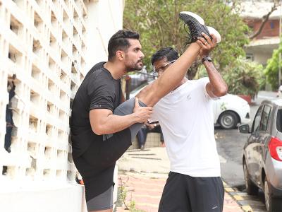 स्ट्रेचिंग कराते दिखे अंगद बेदी
